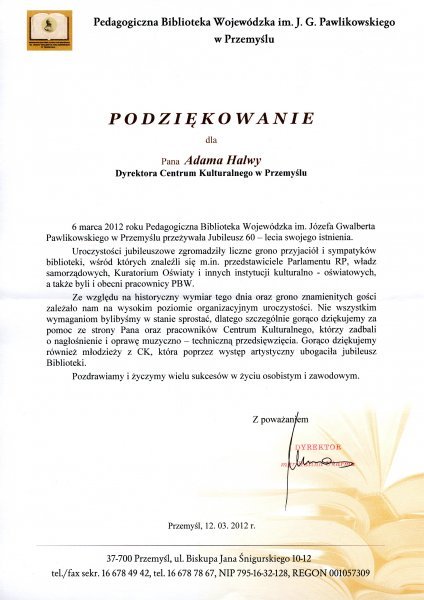Podziękowanie od Pedagogicznej Biblioteki Wojewódzkiej w Przemyślu