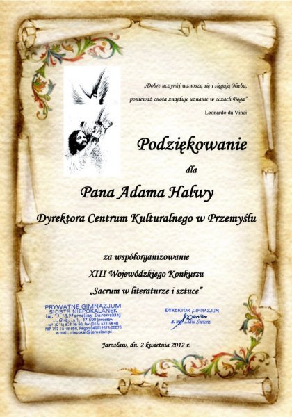 Podziękowanie za współorganizację konkursu "Sacrum w literaturze i sztuce"