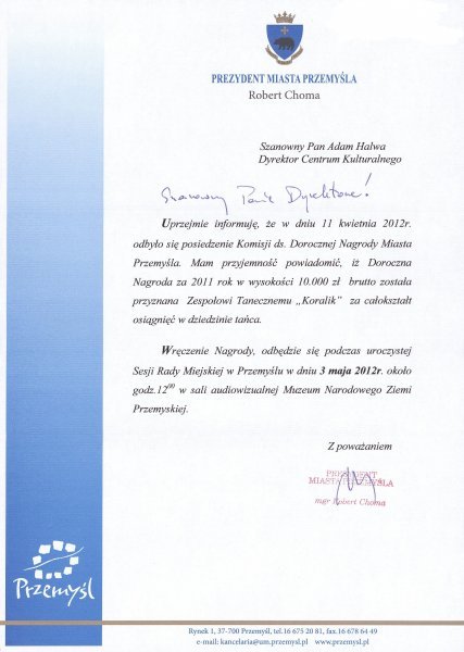 Doroczna Nagroda Miasta Przemyśla dla Zespołu Tanecznego "Koralik"